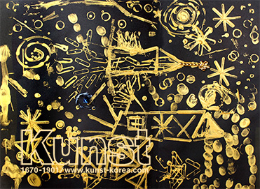 대전유성구지사의 슬찬이는 KUNST KINDHEIT 수업을 하며 다양한 오브제로 금색 물감을 찍어, 어두운 배경 위에 우주 공간을 표현해 보았습니다. 다양한 크기와 모양으로 이루어진 반짝반짝 빛나는 로켓과 행성, 별들이 함께 어우러져 화면을 자유롭게 구성하고 있습니다. 대전유성구지사_유슬찬(8세)