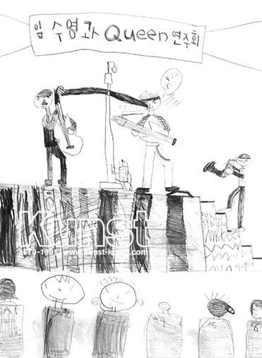 광명지사의 수영이는 WALDORF KINDERGARTEN 수업을 하며, 영국의 록 그룹 Queen과 함께 연주하는 자신의 모습을 그려보았습니다. 무대 위에서 프레디 머큐리와 함께 기타를 치며, 열정적으로 노래 부르는 모습을 연필의 다양한 농도를 활용하여 멋지게 표현해 주었습니다. 광명지사_임수영(8세)