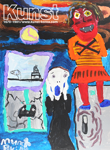 용인수지지사의 수겸이는 KUNST KINDER MUSEUM 수업을 하며, 에드바르트 뭉크의 삶과 작품 세계를 배워보고 작가의 대표작인 절규를 모작해 주었습니다. 원작에서 볼 수 없었던 등장인물과 배경 등을 그려 넣어 표현함으로써 수겸이만의 감성으로 재창조한 응용력이 돋보이는 작품입니다. 용인수지지사_김수겸(12세)