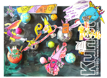 송파지사의 준용이는 KUNST KINDHEIT 수업을 하며 우주공간에서 펼쳐지는 무서운 외계인 대회를 표현하였습니다. 크고 작은 스티로폼 공 위에 재미있는 외계인 드로잉을 오려 붙여, 실제로 행성 위에 외계인들이 떠있는 듯한 입체감을 주는 작품입니다. 송파지사_윤준용(7세)