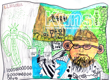 평소에 익숙하게 사용하는 펜이지만 두께와 표현방법에 따라 달라지는 느낌을 응용하여, 천원과 만원의 주인공인 이황과 세종대왕의 얼굴을 위트있고 재미있게 묘사해 주었어요. 펜들의 겹쳐지는 효과, 얇은 펜을 이용한 세부묘사, 굵은 펜의 무거운 느낌을 조화롭게 이용하였고, 부분채색으로 지폐의 느낌을 더한 형서의 감각이 느껴집니다. 서초지사_안형서(8세)