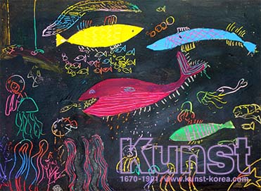 광주지사의 시원이는 KUNST KINDER MUSEUM 수업을 하며, 파울 클레의 삶과 작품세계를 배워보았습니다. 아이와 같이 자유롭고 실험적인 표현을 좋아했던 작가처럼 시원이도 스크래치 기법을 응용하여, 화려하고 멋진 바닷속 풍경을 표현하였습니다. 원색적인 색감의 크고 작은 물고기와 자유로운 바다생물 드로잉이 감각적인 작품입니다. 광주지사_허시원(9세)