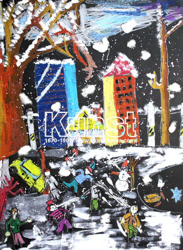 명한이는 우리 주변 생활 속의 자연과 과학에 대해 느껴보고 그림으로 표현해보는 시간을 가졌습니다. 습관적으로 눈오는 날의 이미지를 막연하게 그린 것이 아닌, 실제 명한이가 살고 있는 아파트 단지의 모습과 전봇대의 섬세한 표현, 아이들의 다양한 동세, 옷의 컬러감과 활동적인 모습들을 통해 명한이의 관찰력과 자유로운 드로잉 실력을 느낄 수 있습니다. 광주지사_고명한(11세)