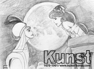 성북구지사의 은재는 KUNST TRAVEL 수업을 하며 미국 대표사의 디즈니 알라딘의 한 장면을 표현해보았습니다. 알라딘과 자스민공주가 서로 마주보는 장면을 연필소묘로 음영감있게 묘사한 작품입니다. 성북구지사_고은재(13세)