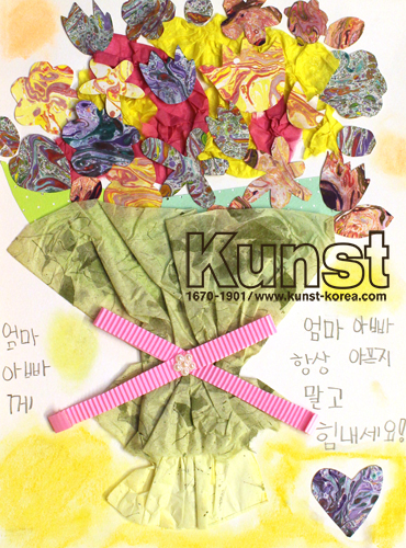 마산회원구지사의 서연이는 KUNST FACTORY 수업을 통해 부모님을 향한 서연이의 마음이 담긴 꽃다발을 만들어보았습니다. 마블링 기법을 통해 패턴지를 만들고 꽃 모양으로 오려서 만든 꽃들이 사랑스러운 작품입니다. 마산회원구지사_홍서연(9세)