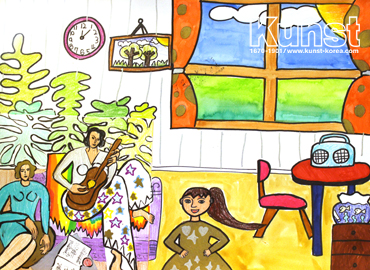 마산회원구지사의 시원이는 KUNST KINDER MUSEUM 수업을 통해 앙리 마티스의 작품세계를 배워보았습니다. [음악(The Music),1910] 작품 속 배경을 확장하여 방안의 공간으로 표현한 후, 음악을 듣고 있는 나의 모습을 함께 그려주었으며 다양한 수채화도구로 원색적인 색채표현을 해주었습니다. 마산회원구지사_정시원(9세)