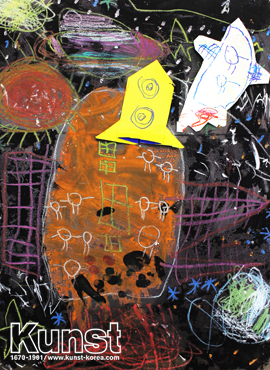 경남김해지사의 홍준이는 KUNST KINDHEIT 수업을 하며 검은 도화지 위에 알록달록 크레파스로 외계인과 우주선 그리고 행성들을 표현했습니다. 포인트로 색종이 로켓을 만들어 신비롭고 광활한 우주를 완성해주었습니다. 경남김해지사_윤홍준(6세)