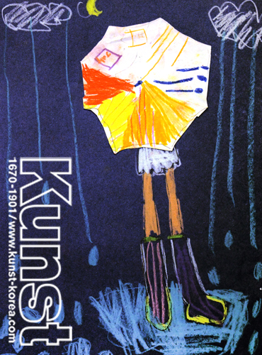 성동구지사의 시호는 WALDORF KINDERGARTEN 수업에서 검정색지 위에 크레파스로 드로잉을 해보았습니다. 구름과 비 그리고 물웅덩이는 거친 느낌으로 표현하였고 보다 섬세하게 채색한 사람의 뒷모습에는 흰색 종이에 드로잉 한 우산을 오려 붙여주어 검은색 배경과 대비되며 돋보이는 그림을 완성해주었습니다. 성동구지사_안시호(7세)