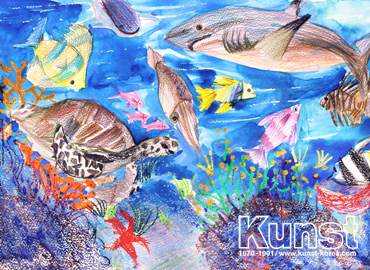 마산회원구지사의 성빈이는 NATURAL & SCIENCE 수업을 통해 다양한 바닷속 생물들을 관찰하고 그려보는 시간을 가졌습니다. 둥실둥실 헤엄치는 거북이, 알록달록 열대어, 뾰족한 오징어, 날렵한 상어를 색연필로 정밀하게 묘사한 뒤 푸르고 깊은 바닷속의 풍경을 수채화로 채색하여 완성한 작품입니다. 마산회원구지사_박성빈(9세)