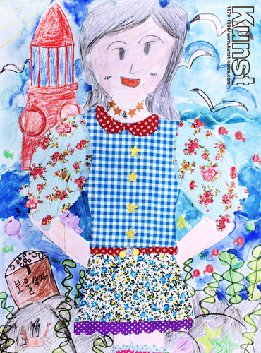 청주청원지사의 태린이는 MAKE & PLAY 수업을 하며 여름날 바닷가에서 직접 만든 옷을 입고 즐겁게 노는 모습을 그리는 시간을 가졌습니다. 푸른 바다에 어울리는 파란색 패턴지로 의상을 솜씨 있게 표현하고, 빨간 등대와 날아다니는 갈매기 등을 배경에 함께 표현하여 활기찬 여름날의 풍경을 그려준 작품입니다. 청주청원지사_김태린(10세)