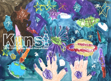 용산지사의 지상이는 KUNST KINDHEIT 수업에서 반짝반짝 로켓이 있는 우주에 대해 마음껏 상상해보고 그림으로 표현해보았습니다. 지상이의 상상 속 우주에는 손바닥 괴물도 살고 있고 작고 귀여운 뾰족 행성도 보이네요. 풍부한 상상력으로 만들어진 귀여운 드로잉이 옹기종기 모여 조화롭게 구성된 작품입니다. 용산지사_이지상(7세)