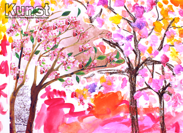 대전서구지사 의재는 KUNST KINDHEIT 수업을 하며 휴지 재료를 사용하여 벚꽃을 표현하고 화면을 구성해보는 시간을 가졌습니다. 휴지에 분홍 벚꽃색의 물감을 묻혀 나무에 꽃이 핀 듯한 느낌으로 연출해 주고, 다채로운 색의 수채화 물감으로 배경을 채워 서서히 물드는 봄의 느낌을 나타내주었습니다. 재료를 활용한 표현력이 돋보이는 작품입니다. 대전서구지사_윤의재(9세)