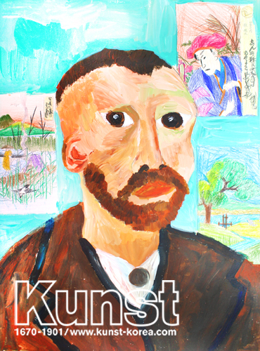 마산회원구지사의 윤후는 KUNST KINDER MUSEUM 수업에서 일본 회화 우키요에의 영향을 많이 받은 고흐의 초상화를 재해석하여 모작해보는 시간을 가져보았습니다. 배경에 색연필로 표현한 우키요에 작품과 전면에 임파스토 기법을 활용하여 두꺼운 터치로 표현한 인물이 대비되면서 기존의 작품과는 다른 윤후만의 초상화 작품으로 완성해주었습니다. 마산회원구지사_김윤후(11세)