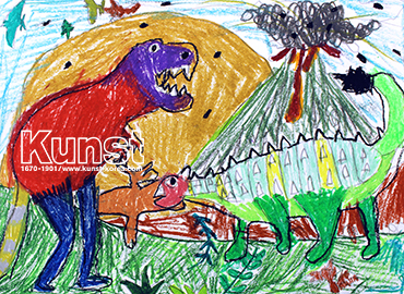 마산회원구 의준이는 KUNST KINDHEIT 수업을 하며 공룡에 대한 특징을 관찰하고, 공룡시대의 장면을 상상하여 그려보는 시간을 가졌습니다. 다양한 생김새로 묘사된 공룡들을 중심으로 용암이 흐르는 화산의 배경을 그려 완성한 생동감있는 작품입니다. 마산회원구지사_오의준(7세)