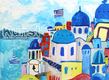 대전서구지사의 성현이는KUNST TRAVEL 수업에서 그리스의 아름다운 섬 '산토리니' 에 대해 배워보고 그림으로 표현해보았습니다. 가파른 땅에 아기자기하게 밀집되어있는 푸른 집들과 교회당을 구성하여 동화 같은 분위기의 아름다운 마을로 잘 표현한 작품입니다. 대전서구지사_임성현(8세)
