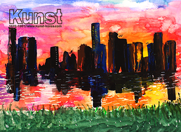 양천지사 서현이는 KUNST NATURAL & SCIENCE 수업을 하며 습식 수채화를 통해 저녁 하늘의 풍경을 표현해보는 시간을 가졌습니다. 여러 가지 색을 조화롭게 변화를 주어 배경을 채색한 뒤 대비되는 짙은 색으로 건물들을 강조하여 차분하면서도 신비로운 풍경화를 완성해주었습니다. 양천지사_전서현(9세)