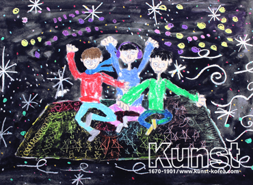 구로지사의 윤우는 KUNST KINDHEIT 수업에서 멋진 양탄자를 그려보았습니다. 스크래치 기법을 활용하여 양탄자 위의 알록달록한 패턴을 표현하고 그 위에 있는 친구들을 즐겁게 표현 하였습니다. 크레파스와 물감이 섞이지 않는 성질을 활용하여 배경에도 패턴을 넣어 감각적이면서도 돋보이게 표현한 작품입니다. 구로지사_정윤우(8세)