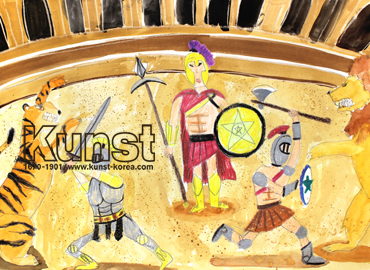 대전서구지사의 원준이는 KUNST TRAVEL 수업에서 이탈리아의 건축물과 역사에 대해 배워보고 콜로세움에서 검투사들이 맹수와 결투를 하는 장면을 그림으로 묘사하였습니다. 검투사들의 특수한 복장뿐만 아니라 동세도 정확하고 세밀하고 묘사하였으며, 맹수들의 이빨과 동작을 위협적이게 표현해 결투의 긴장감을 잘 나타낸 작품입니다. 대전서구지사_최원준(9세)