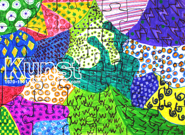 청주청원지사의 성택이는 THINK & CREATIVE 수업에서 보색의 개념에 대해 배워보고 보색을 활용한 패턴이 있는 퍼즐을 만들어 보았습니다. 파란색의 배경 위에는 노란색의 패턴을 그려주었으며, 연두색 배경 위에는 보라색의 패턴을 그려주어 보색이 주는 강렬한 효과를 잘 나타낸 작품입니다. 청주청원지사_류성택(12세)