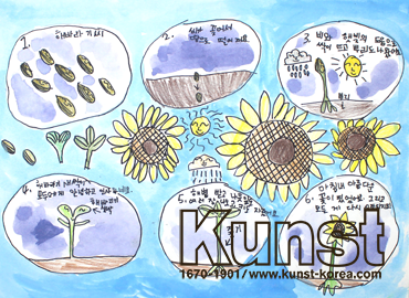 강남지사의 주원이는 NATURAL & SCIENCE 수업에서 식물이 자라는 단계를 공부해 보았습니다. 해바라기 씨앗을 시작으로 꽃이 피는 과정까지를 주원이만의 독창적인 표현법으로 그려 보았습니다. 씨앗과 줄무늬가 있는 겉껍질 열매를 자세히 관찰하여 표현하였으며 잎은 어긋나고 넓은 달걀 모양으로 줄기는 굵게 뻗은 모습까지 멋지게 표현한 작품입니다. 강남지사_이주원(9세)