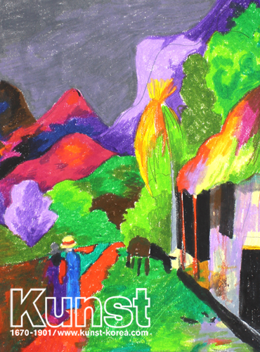 대전서구지사의 의재는 KUNST KINDER MUSEUM 수업에서 고갱의 작품인 Road in Tahiti, 1891을 재현하였습니다. 문명의 때 묻지 않은 타히티에서 원시적인 삶과 존재의 의미를 찾고 싶었던 고갱의 작품들은 독창적인 색감과 양식으로 20세기 피카소를 비롯한 많은 화가에게 지대한 영향을 주었습니다. 특유의 화풍과 과감한 색 면, 감정을 주관적으로 표현한 독창적인 작품들을 배워보는 시간이었으며 의재는 고갱보다도 더욱 과감한 색 면을 사용하여 의재만의 아름다운 타히티를 멋지게 표현하였습니다. 대전서구지사_윤의재(11세)