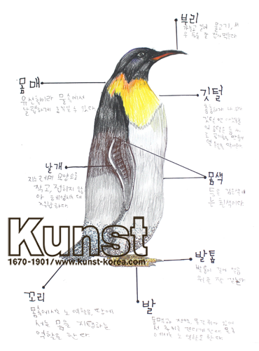 마산회원구지사의 준오는 KUNST NATURAL & SCIENCE 수업에서 펭귄 중 가장 몸집이 큰 황제펭귄을 자세히 관찰하고 표현해 보는 시간이었습니다. 남극의 겨울에 알을 낳고 양육하는 유일한 동물로 수컷이 알을 품으며 집단생활을 하는 부성애가 큰 동물이라는 것을 배워보았습니다. 펭귄의 구조적인 특징을 연필과 사인펜 등 다양한 재료를 이용하여 멋지게 표현하였습니다. 마산회원구지사_김준오(12세)