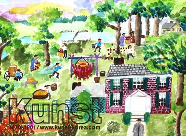 청주청원지사의 혜안이는 KUNST KINDER MUSEUM 수업에서 안나 메리 로버트슨 모지스의 삶과 작품세계를 배워보고 [사과잼 만들기,1947]를 모작해 보았습니다. 적색 벽돌집 옆에서 잼을 만들고 있는 마을 사람들의 정다운 모습을 멀리서 바라본 시점으로 아기자기하게 표현해 주었습니다. 청주청원지사_김혜안(14세)