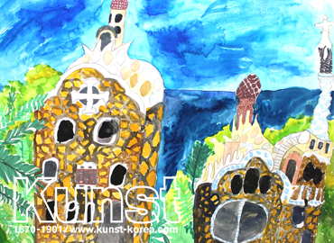 마포지사의 서준이는 KUNST TRAVEL 수업에서 스페인을 공부해 보는 시간이었습니다. 예술과 문화의 도시 바르셀로나의 가든 시티로 구상된 안토니 가우디의 작품 구엘 공원을 그려보았습니다. 이 공원은 언덕에 자리 잡고 있어 바르셀로나의 탁 트인 전망과 자유로운 곡선의 다채로운 모자이크 타일들로 독창적인 예술미의 진수를 보여주는 곳입니다. 청량한 푸른 바다와 안토니 가우디의 섬세한 장식과 색채를 멋지게 담은 서준이만의 멋진 작품입니다. 마포지사_이서준(10세)