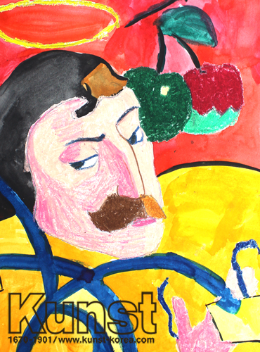 대전서구지사의 여준이는 KUNST KINDER MUSEUM 수업을 하며, 폴 고갱의 삶과 작품세계를 배워보았습니다. [Self Portrait with Halo,1889]을 모작해보며 일본 판화에 영감을 받은 작가의 표현기법을 이해하고 두꺼운 윤곽선 표현, 평면적이고 과감한 원색 채색으로 작품을 완성해주었습니다. 대전서구지사_노여준(10세)
