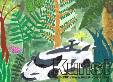 대전중구지사의 성준이는 KUNST KINDER MUSEUM 수업에서 앙리 루소의 작품을 감상해보고 재해석해보는 시간을 가져보았습니다. 그의 작품 '열대 폭풍 속의 호랑이' 작품이 궂은 날씨 속 호랑이를 표현한 반면에 성준이는 좋아하는 슈퍼카를 열대 우림 안에 멋지게 그려 주었습니다. 슈퍼카를 정면에 배치하여 강렬하고 돋보이는 작품으로 완성해준 작품입니다. 대전중구지사_김성준(11세)